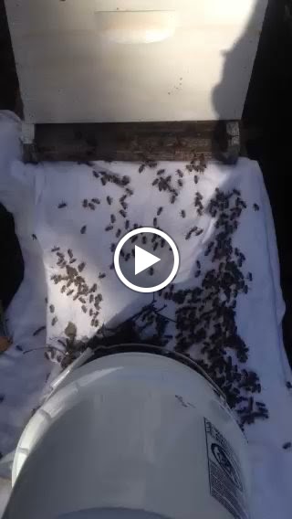 | The swarm is dumped from a large sugar lined bucket at the base of a new hive on a white sheet. For some reason that white sheet makes them march right up and into the hive. Who knew??? |